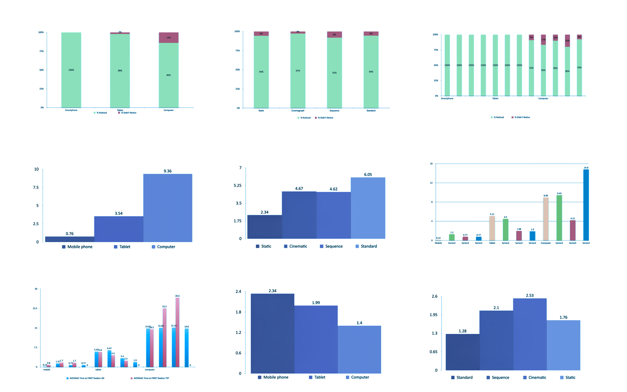 Results couldn’t be clearer. Ads are definitely seen. Especially on smartphones, where they take almost a third of the screen’s real estate, making them virtually impossible to overlook. On mobile devices, the audience’s gaze was sustained the longest by the cinemagraph type, and on the laptop, it was the image sequence.
