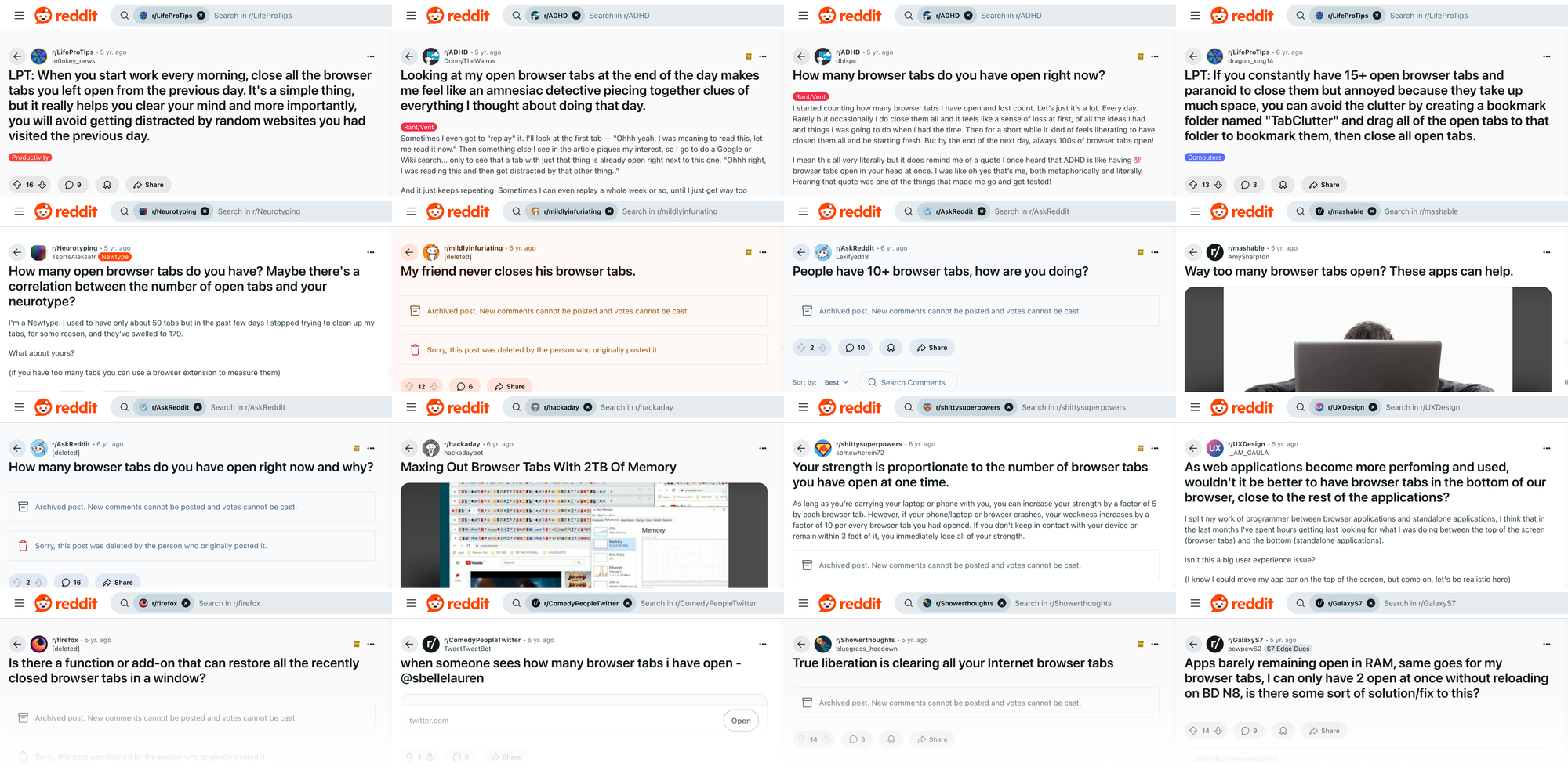 Searching Reddit and other social media quickly revealed repeated threads and hundreds of posts by people struggling with too many open tabs. So much so, that this has become a part of pop culture.