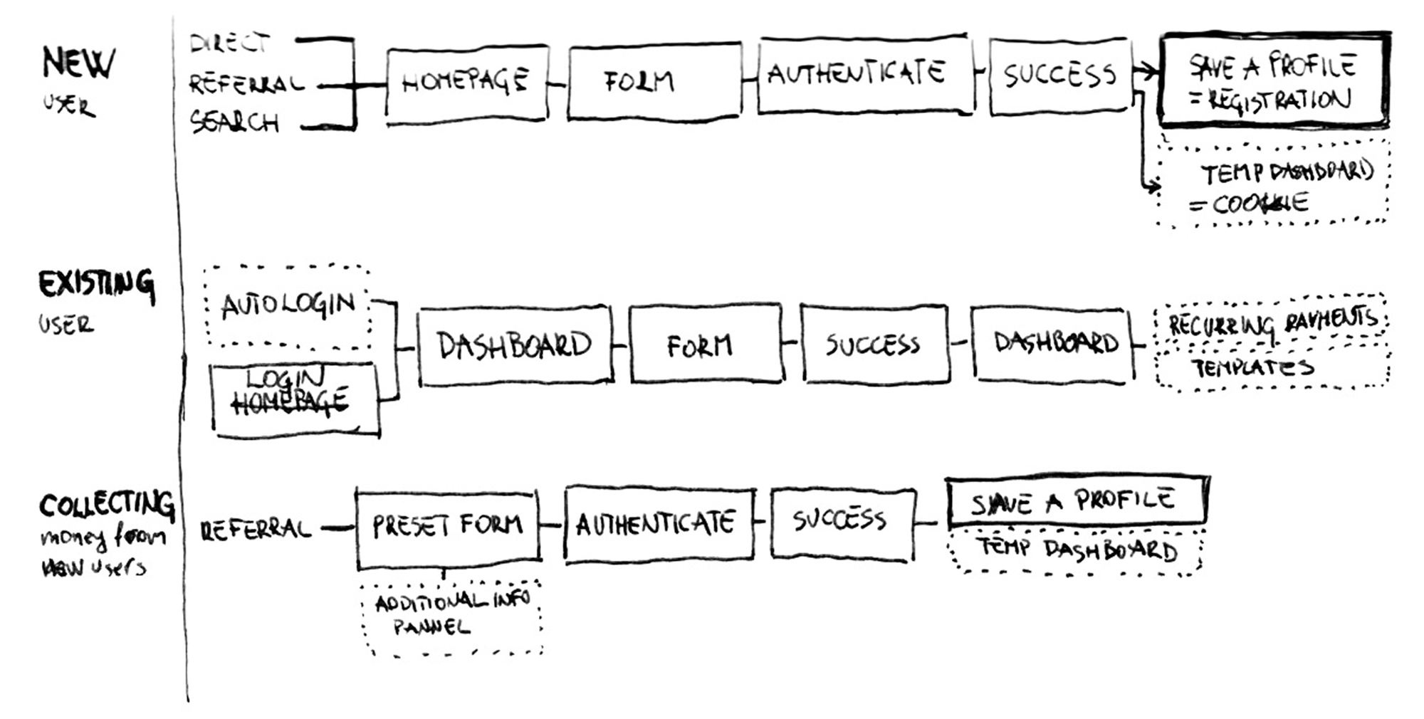 1. Review and confirtm step; 2. Payment call-to-action step; 3. Confirmation screen; 4. Account dashboard with payments history